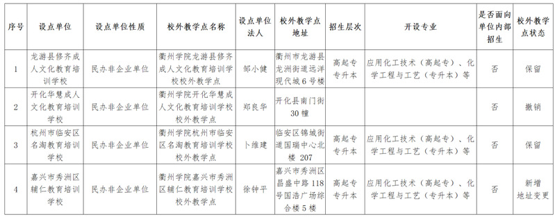 根据教育部办公厅《关于做好 2026 年度高等学历继续教育专业和校外教学点设置与管理工作的通知》(教职成厅函〔2026〕8号)文件精神,经校外教学点申请,终身教育中心走访调研,经校外教学点设置论证评议会议论证、校长办公会议讨论通过,衢州学院2026年高等学历继续教育校外教学点设置如下表所示,备案结果以浙江省教育厅公布的文件为准。